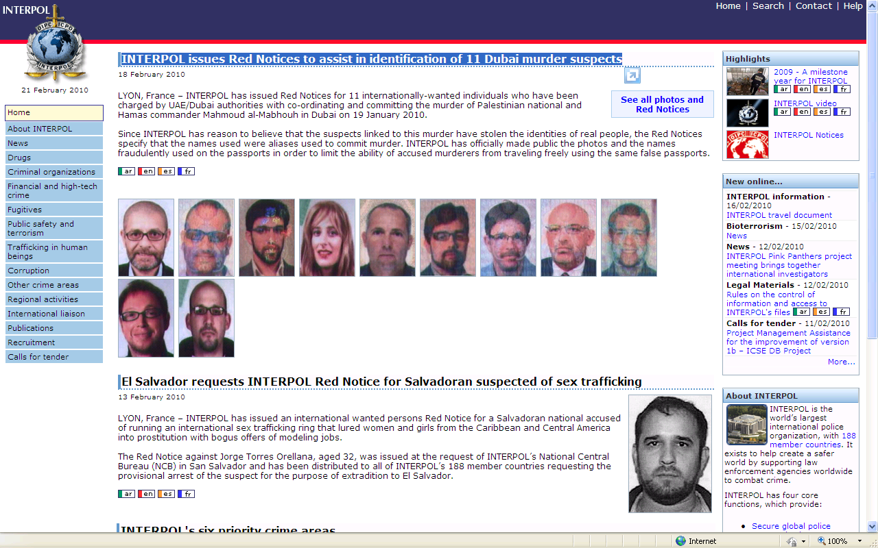 Tal medida é muito comum no âmbito da cooperação penal internacional pela via policial. Esta semana o website da Interpol divulga a existência de mandados de prisão expedidos por autoridades de Dubai, nos Emirados Árabes Unidos, para captura internacional de onze indivíduos (supostamente agentes do serviço secreto israelense), suspeitos de envolvimento na morte de um dos líderes do Hamas, Mahmoud al-Mabhouh, em 19 de janeiro de 2010. Todos foram incluídos em difusão vermelha. Veja o print: