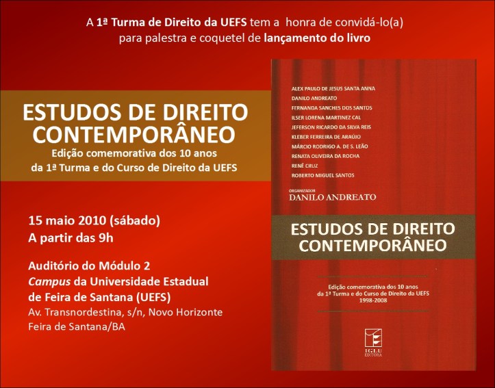 A primeira turma do curso de Direito da Uefs lançará livro comemorativo no sábado, 15/maio, às 9h, no módulo 1 do campus da Universidade Estadual de Feira de Santana.