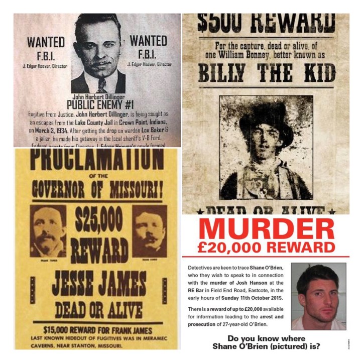 No Velho Oeste norte-americano circulavam incontáveis cartazes de Wanted. Procura-se Fulano ou Beltrano, vivo ou morto. E por isso se oferecia um punhado de dólares ou milhares deles. Caçadores de recompensas (os chamados bounty hunters) cruzavam o país até as entranhas do México e do Canadá. Vários dos procurados ganharam fama lá e no resto do mundo graças a Hollywood.