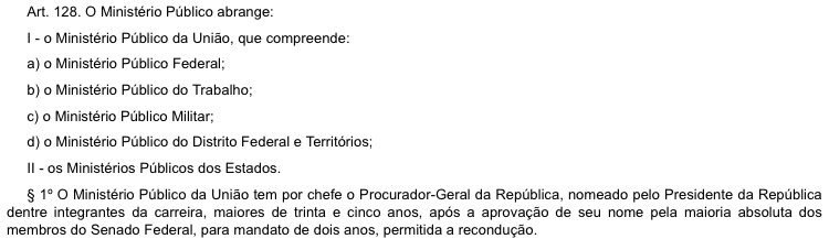 § 1º O Ministério Público da União tem por chefe o Procurador-Geral da República, nomeado pelo Presidente da República dentre integrantes da carreira, maiores de trinta e cinco anos, após a aprovação de seu nome pela maioria absoluta dos membros do Senado Federal, para mandato de dois anos, permitida a recondução.