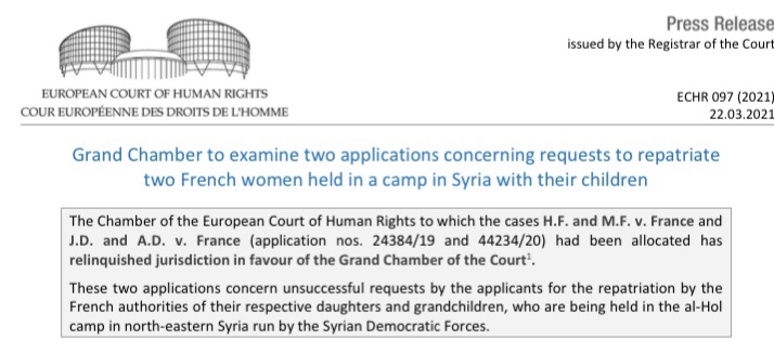 No primeiro, uma cidadã francesa e seu companheiro partiram para a Síria em 2014 para juntar-se ao Estado Islâmico (ISIL ou Daesh). Essa mulher francesa teve dois filhos na Síria em 2014 e em 2016. Atualmente ela está detida com sua prole no campo de refugiados Al-Hol, no nordeste sírio, região controlada por forças curdas.
