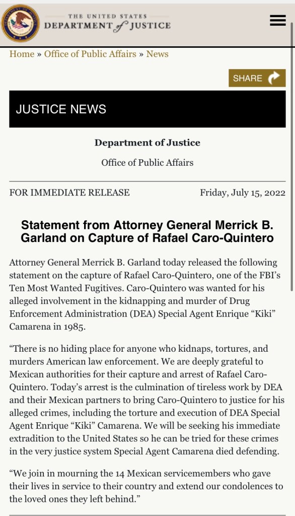 Finalmente foi novamente preso o traficante mexicano Rafael Caro-Quintero, do extinto Cartel de Guadalajara, acusado da morte do agente especial da Drug Enforcement Administration (DEA) Enrique “KiKi” Camarena. Seu homicídio ocorreu no México em fevereiro de 1985, quando Kiki Camarena atuava como agente infiltrado.