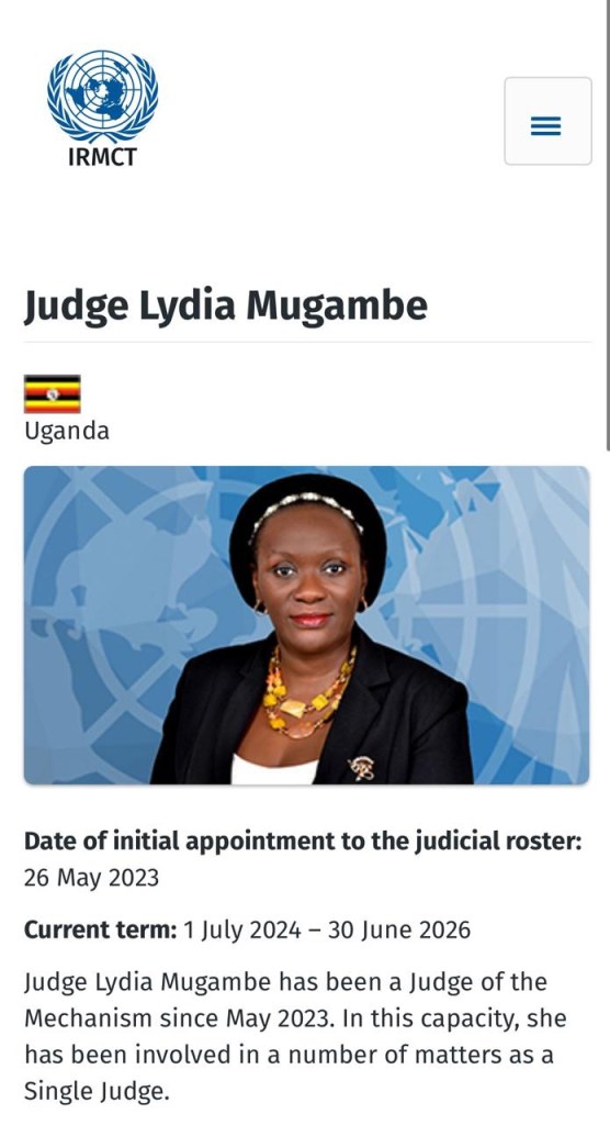 Em 2023, Mugambe, que era uma respeitada jurista de Uganda, tornou-se juíza do Mecanismo Residual dos Tribunais Penais de Ruanda e da Ex-Iugoslávia, conhecido em inglês como “International Residual Mechanism for Criminal Tribunals” (IRMCT).
